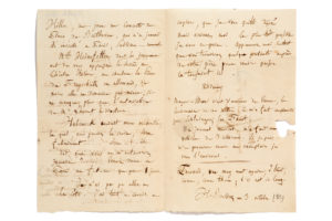 BERLIOZ Hector (1803 - 1869)L.A.S. «H. Berlioz», [Paris] 3 octobre 1829, à son ami Humbert FERRAND, à Belley (Ain) ; 3 pages in-8, adresse. Belle lettre de ses débuts, sur l'organisation d'un concert. Il lui écrit à la hâte. «Les hostilités...