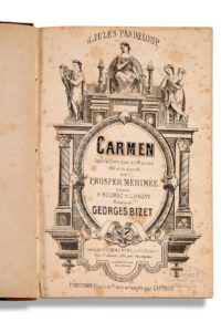 BIZET Georges (1838 - 1875)Carmen, opéra Comique en 4 actes. Tiré de la nouvelle de Prosper Mérimée. Poème de H. Meilhac et L. Halévy. Musique de Georges Bizet (Paris, Choudens Père et Fils, [1875]). In-4 (27,2 x 18,2cm) de (4)-351 pp.,...