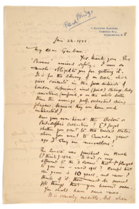 BRIDGE Frank (1879 - 1941)L.A.S., «Frank Bridge», Kensington 24 janvier 1926, à Lucien GARBAN ; 2 pages in-8 à son adresse ; en anglais. Il relercie pour l'envoi de la Pavane [Pavane pour une infante défunte de RAVEL], qu'il va faire jouer par...
