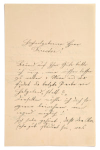 BRUCKNER Anton (1824 - 1896)L.A.S. «Bruckner», Steyr 2 octobre 1893, [à Eduard KREMSER] ; 2 pages in-8 ; en allemand. Au sujet de la prochaine création de sa cantate Helgoland, sa dernière œuvre achevée. [Eduard KREMSER (1838-1914) dirigeait le Wiener Männergesangverein. Pour célébrer le cinquantième anniversaire de ce chœur, il commanda cette cantate à Bruckner. Helgoland fut créé le 8 octobre 1893 à la Hofb urg, par le chœur et l'Orchestre philharmonique de Vienne, sous la direction de Kremser.] Bruckner demande quand aura lieu la répétition générale : «Wann und wo fi ndet die letzte Probe von Helgoland statt ?» Il aimerait être là, le plus près possible. Il a entendu dire que le chœur a été très bien étudié, comme on pouvait l'attendre des capacités et du génie de ses chefs : «Ich habe gehört, daß der Chor sehr gut studiert sei, was bei der Tüchtigkeit u. Genialität desHn. Dirigenten nicht anders zu erwarten war». Il souhaite à la célèbre société bonheur, gloire et admiration : «Viel Glück, und höchsten Ruhm und Bewunderung Ihnen und dem höchst berühmten Vereine !»....