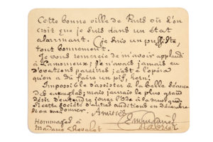 CHABRIER Emmanuel (1841 - 1894)L.A.S. «Emmanuel Chabrier», [La Membrolle] 27 novembre 1893, [à Émile CHEVALET] ; 2 pages oblong in-12. Il est en Touraine avec sa femme, chez sa belle-mère : «Ici, je suis comme un coq en pâte ; j'en profi te pour travailler comme un nègre, ma santé est excellente ; j'ai bien le temps de retourner dans cette bonne ville de Paris où l'on croit que je suis dans un état alarmant. (Je suis un puffi ste, tout bonnement)». Il évoque l'exécution de l'ouverture de Gwendoline par Lamoureux (les 12 et 19 novembre) : «je n'avais jamais eu d'ovations pareilles ; c'est à l'opéra qu'on a dû faire un pif, hein !» Il ne peut assister à «la belle séance des aveugles», mais aimerait y «entendre jouer l'Ode à la musique» lors d'une autre audition...