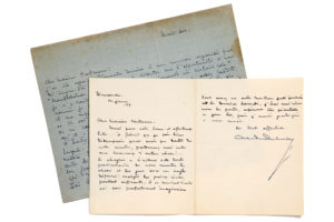 DEBUSSY Claude (1862 - 1918)2 L.A.S. «Claude Debussy», 1895-1899, à Georges HARTMANN ; 2 pages et demie oblong grand in-8 (papier bleuté), et 1 page et demie in-12. À son premier éditeur, au sujet des Nocturnes. Mardi soir [26 novembre 1895]. Debussy relate avec humour une réunion organisé par LUGNÉ-POE «où l'on devait disserter sur l'opportunité d'une “Manifestation d'art où la Musique jouerait un certain rôle”», à laquelle assistaient notamment V. d'Indy, E. Chausson, P. de Bréville, S. Lazzari... Le théâtre de l'Œuvre demande «le concours et l'appui des jeunes musiciens», à qui Lugné-Poe demandait de désigner une œuvre. «Ici les jeunes musiciens ne bougèrent pas plus que d'antiques bustes, et l'assistance palpitait ; enfi n d'Indy retrouva sa voix et prononça le nom de Pélléas, quelques-uns appuyèrent et ce fut presque à pleurer d'émotion fraternelle ! Mais voilà qu'un vieux monsieur se lève et dit d'une voix plus ferme que ne le comportait son âge : “Il faut que l'Œuvre donne une chose vraiment indépendante et qui ne puisse être possible ni à l'Opéra, ni à l'Opéra-Comique ! Nous en avons assez des formules wagnériennes et des faux drames lyriques qui en sont issus”. Là-dessus tout le monde se lève, parle à la fois, et cela ressemblerait à une réunion d'anarchistes si Lugné-Poé n'entraînait pas le monde vers un petit local, où l'on boit des choses évidemment norvégiennes, le résultat de tout ceci c'est une autre lettre de Lugné-Poè reçue ce matin, où il déclare être tout à ma disposition : il pense avoir 25 à 30000 F ! et le concours de L. Jéhin ! Naturellement vous me direz ce qu'il faut penser de tout cela ?»... Il ajoute : «Les Nocturnes s'avancent, quoique je viens d'être assez occupé de désagréables rhumatismes, j'espère que vous croirez que je ne perds pas une minute ! tant je tiens à vous prouver mon sincère désir de vous être reconnaissant».... 22 janvier 1899. «Merci pour votre bonne et aff ectueuse lettre... il fallait que je sois bien désemparé pour avoir pu douter de votre amitié, pardonnez-moi cela avec beaucoup d'autres choses !... le chagrin a d'ailleurs cette triste particularité de vous montrer les choses et les gens sous un angle déformé ; malgré les peines réelles, pourtant suffi santes, il en survient d'autres qui sont parfaitement imaginaires. Vous aurez un autre Nocturne Jeudi prochain et le dernier, Samedi, j'irai moi-même vous le porter espérant être présentable ce jour-là puis, j'aurai grande joie à vous revoir».... Correspondance, nos 1895-69 et 1899-6.