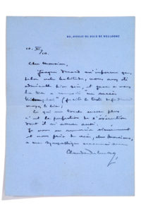 DEBUSSY Claude (1862 - 1918)L.A.S., 10 mars 1910, au chef d'orchestre à RHENÉ-BATON ; 1 page in-12 papier bleu. «Jacques Durand m'informe que, selon votre habitude, vous avez été admirable hier soir, et grâce à vous la Mer a remporté “un...