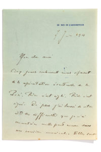 DUKAS Paul (1865 - 1935)L.A.S., 7 juin 1911, à Serge de DIAGHILEW à l'Hôtel Brighton ; 3 pages in-12 à son adresse, enveloppe. Au sujet de La Péri pour les Ballets Russes. [Commande de Diaghilev pour les Ballets Russes, la production de La Péri, avec décor et costumes de Léon Bakst, et Natacha Trouhanova dans le rôle-titre, fut fi nalement annulée, Diaghilev se montrant mécontent de la danseuse. Le ballet fut monté le 22 avril 1912 au Châtelet avec Trouhanova, dans une chorégraphie d'Ivan Clustine, et des décor et costumes de René Piot.] «Cinq jours seulement nous séparent de la représentation éventuelle de la Péri. Rien n'est réglé. Rien n'est signé. De plus j'ai trouvé de votre côté des diffi cultés que je n'ai rencontrées nulle part encore dans ma carrière musicale. Elles sont bien pour me surprendre étant donné que c'est vous qui m'avez demandé mon ouvrage. Il ne me plaît pas d'être traité avec cette condescendance et de paraître devoir à votre esprit de sacrifi ce ce que je n'ai pas sollicité. Et comme le temps manque pour aplanir tant de diffi cultés et pour donner de mon ouvrage une exécution satisfaisante je le retire purement et simplement et vous assure de la gratitude que je conserve de vos intentions»...