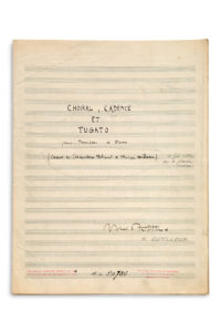 DUTILLEUX Henri (1916 - 2013)MANUSCRIT MUSICAL autographe signé «Henri Dutilleux», Choral, Cadence et Fugato pour trombone et piano (1950). ; titre et 10 pages in-fol. Rare pièce pour trombone et piano. Écrit à la demande de Claude Delvincourt,...