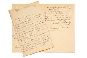 FAURÉ Gabriel (1845 - 1924)L.A.S., Paris 18 octobre [1890, à Winnaretta Singer, princesse de SCEY-MONTBÉLIARD, future princesse de POLIGNAC] ; 6 pages et demie in-8 (trous de classeur). Belle lettre de reconnaissance à la mécène. [La princesse a proposé à Fauré une somme de 25.000 francs pour composer une œuvre musicale sur un texte poétique.] Il lui dit «quelle émotion et quel bonheur vous avez fait naître dans ma maison et comment nous marchons extasiés à travers cette mille et deuxième nuit !» Il reste «confondu devant un pareil témoignage de votre royale sympathie [...] J'en ai eu une petite larme qui deviendra quelque jour un mi bémol ou un fa dièze, mais qui deviendra à coup sûr quelque chose qui vous appartiendra bien complètement !» Il voudrait pouvoir aller la rejoindre à Paignton, mais est retenu par son service à la Madeleine. Il s'arrangera cependant pour aller la retrouver à Florence. Il est depuis quelque jours en possession «du premier acte d'un drame lyrique, le premier qui m'ait vraiment tenté et entraîné [...] d'un jeune poète [Émile Moreau] dont on va représenter prochainement une Cléopâtre en collaboration avec Sardou. Il a du talent et il travaille dans le neuf ! J'étais donc ravi d'avoir enfi n un beau poëme» ; mais avec sa médiocre santé et ses soucis matériels, il lui aurait fallu des années «avant d'achever une œuvre aussi considérable». Et voici que la Princesse vient «tout arranger d'un mot et me donner des loisirs que je n'aurais jamais osé entrevoir, même en rêve !» Il est heureux et «fi er d'être le musicien choisi pour inaugurer votre atelier !»...