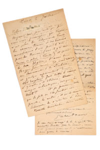FAURÉ Gabriel (1845 - 1924)L.A.S., Lundi 6 juillet [1891, à Winnaretta Singer, princesse de SCEY-MONTBÉLIARD, future princesse de POLIGNAC] ; 8 pages in-8 (en-tête de la lettre, le mot «Madame» a été ajouté d'une autre main sur le mot «Princesse» eff acé). Belle et longue lettre sur un projet de comédie musicale avec Verlaine, L'Hôpital Watteau, fi nancé par la Princesse. Il évoque la Princesse dans Venise en fête... Il a beaucoup parlé d'elle avec Mme GREFFULHE, mais est resté discret devant sa curiosité : «quelle précieuse chose que la discrétion ! Être discret ! silencieux ! inspirer le délicieux abandon de la confi ance ! n'est-ce donc pas charmant ?»... Puis il raconte une visite de VERLAINE à la Madeleine, dont il était sans nouvelles : «il m'attendait et c'était pour me prier de lui prêter 2 francs pour déjeuner ! [...] L'hopital Wateau n'est, hélas, qu'un leurre !» La lettre du 2 juin n'était qu'un «simple appel de fonds basé sur un semblant de projet. Semblant de projet n'est même pas exact : il n'y a pas de projet du tout : il y a un titre. Voici, m'a-t-il dit : nous aurions Pierrot tordu de rhumatismes et de goutte, Arlequin ataxique, Cassandre dément à force de vieillesse, Colombine pourrie de ... (Impossible à ma plume d'écrire le mot, autant qu'il vous serait impossible de le lire). Mais que feront de leurs maux tous ces personnages ? Je ne le sais pas encore, a-t-il ajouté, mais le point de départ n'est-il pas cruellement comique ?» Fauré lui a demandé d'élaborer dans un bref délai un plan qu'il soumettra à la Princesse ; mais il pressentait depuis longtemps que Verlaine «n'est plus capable de rien faire avec suite, qu'appliquer son esprit à quoi que ce soit est au dessus du peu de ressort qui lui reste, hélas !»...