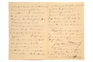 FAURÉ Gabriel (1845 - 1924)2 L.A.S. «Gabriel Fauré», [1899 - 1900, à un ami [WILLY] ; 3 et 2 pages in-8 (trous de classeur). Au sujet des représentations aux Arènes de Béziers. [On y créera le 27 août 1900 le Prométhée de Fauré, sur un...