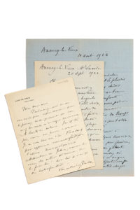 FAURÉ Gabriel (1845 - 1924)3 L.A.S.,1913-1924, à Alfred BRUNEAU ; 4 pages in-8 et 1 page et quart in-4. Monte-Carlo [début mars 1913]. Au sujet de Pénélope (l'opéra fut créé à Monaco le 4 mars 1913). Il le remercie pour un renseignement concernant la Société des auteurs. «J'ai été très pris, comme vous pouvez le penser. [...] Vous savez par expérience comment fonctionne l'usine. Mais quel précieux collaborateur que Jehin [le chef d'orchestre Léon JEHIN] ; comme il aime son métier et comme il le fait bien ! Avec lui je n'ai que des satisfactions. Vous entendrez Pénélope à Paris sans doute. Je souhaite que cette première - et très probablement dernière tentation théâtrale - vous semble moins ennuyeuse qu'elle me paraît ici !»... Annecy-le-Vieux 20 septembre 1922. Il souhaite à Bruneau de bonnes vacances familiales à La Baule. «Ici nous sommes aux eaux douces ; nous n'avons qu'un lac modeste, mais plein de charme et admirablement encadré. [...] j'ai travailloté, sans hâte, dans la paix des vieilles années !»... Annecy-le-Vieux 14 août 1924. Il est à Annecy-le-Vieux «depuis quelques semaines, après un séjour d'un mois à Divonne, près Genève, [...] sans discrétion, on se laisse faire quand on vogue en pleine quatre-vingtième année ! Ajouetrai-je que vivre longtemps, c'est-à-dire se sentir chaque lendemain plus faible, plus détérioré que la veille, constitue une joie sans mélange ? Vous ne me croiriez pas !»