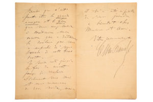 FRANCK César (1822 - 1890)L.A.S. «César Franck», Jeudi soir [6 juin 1889], à Édouard COLONNE ; 2 pages et demie in-8. Il remercie le chef d'orchestre «pour la belle exécution de ma 8ème Béatitude que vous m'avez donnée aujourd'hui. Cela a...