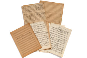 GOUNOD Charles (1818 - 1893)MANUSCRIT MUSICAL autographe signé «Ch. Gounod», Le Vin des Gaulois et la Danse de l'Épée (Légende Bretonne). Chœur à 4 voix d'hommes avec orchestre, décembre 1851 ; titre et 24 pages in-fol. (35 x 27 cm ; quelques déchirures, réparation au scotch à la page de titre). Partition d'orchestre de ce chœur. Ce chœur avec orchestre [CG 193], conçu d'abord en juillet 1849 sous forme d'une pièce pour piano à 4 mains, a été créé à la Société Sainte-Cécile le 15 février 1852, sur des paroles de Gounod : «Mieux vaut vin nouveau que bière»... Gounod écrivait à Pauline Viardot le 12 février : «après avoir fait aux choristes une instruction préalable sur la férocité d'accent que je leur demandais, j'ai obtenu une exécution d'une couleur tellement sauvage que mes voisins auraient pu écrire que c'était un troupeau de lions et de zèbres déchaînés». Gérard Condé parle d'une «composition abrupte et nerveuse, sœur de la Chanson des brigands de Lélio» de Berlioz (Condé, p. 854). En sol mineur à 2/4, elle est marquée All° non troppo e molto energico. L'orchestre comprend grande et petite fl ûtes, hautbois, clarinettes, bassons, cors, pistons, 3 trombones, timbales, cymbale et grosse caisse, triangle, et les cordes. On joint : le manuscrit autographe signé d'un «accompagnement de piano à quatre mains» (titre et 4 pages in-4) ; la partie de violon conducteur autographe (titre et 3 p. in-4, petite découpe) ; une copie de la partition d'orchestre, avec le matériel (sauf les cordes).