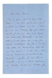GOUNOD Charles (1818 - 1893)L.A.S. «Ch. Gounod», [vers 1865], à sa «chère Marie» ; 3 pages in-8 sur papier bleu. Il remercie ses amis de leur «prévenante hospitalité», il est retourné mentalement dix fois à Verrières. «Mes aff aires ne...