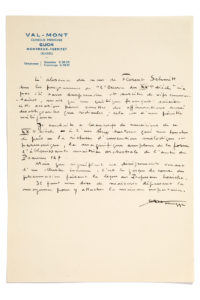 HONEGGER Arthur (1892 - 1955)MANUSCRIT autographe signé «AHonegger», [Glion mars-avril 1952] ; 1 page petit in-4, en-tête de la clinique médicale Val-Mont. Défense de Florent Schmitt. Il proteste contre l'absence de Florent SCHMITT dans les...