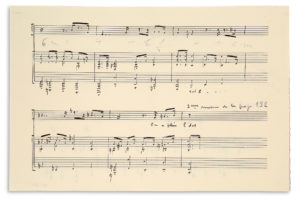 HONEGGER Arthur (1892 - 1955)MANUSCRIT MUSICAL autographe pour Les Aventures du roi Pausole, [1930] ; 2 pages oblong in-4. Créée le 12 décembre 1930 aux Bouff es-Parisiens, l'opérette d'Honegger d'après le roman de Pierre Louÿs sur un livret d'Albert Willemetz remporta un vif succès. Il s'agit ici d'une addition de 10 mesures entre les pages 131 et 132 de la partition, pour voix avec accompagnement de piano. Elle est notée sur 3 systèmes de 3 portées, sans paroles, sauf pour les dernières notes : «On a plein l'dos».