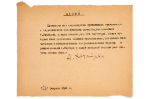 KHATCHATURIAN Aram (1903 - 1978)P.S. «A. Хачатурян», 27 février 1941 ; 1 page oblong in-8 dactylographiée ; en russe. Il a eu, à plusieurs reprises, connaissance des adaptations pour les orchestres d'harmonie réalisées par le camarade GRABAR, et il assure que ces partitions, parmi lesquelles il y avait des œuvres assez complexes, laissent l'impression d'une approche professionnelle irréprochable et montrent le côté très positif du camarade Grabar, comme un vrai connaisseur de son métier.... Document rédigé peu après son Concerto pour violon et orchestre (1940), et juste avant le ballet Gayaneh (1942) comportant la fameuse Danse du sabre.