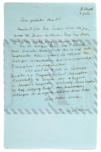 KODÁLY Zoltan (1882 - 1967)L.A.S., Budapest 3 juillet [1966], au Dr Lutz BESCH à Bremen ; ¾ page in-4, adresse au dos ; en allemand. Il n'a pas reçu son livre, et il part le lendemain pour trois mois en Amérique. Il sera jusqu'au 14 juillet à Toronto (Canada), le 6 août à Stanford (Californie), puis à Interlochen (Michigan), du 16 au 26 août, pour le National Music Camp