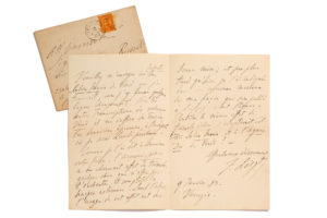 LISZT Franz (1811 - 1886)L.A.S., Venezia 9 janvier 1883, à Giulio RICORDI à Milan ; 3 pages et demie in-8, enveloppe ; en français. Sur ses transcriptions de Verdi. «Depuis 20 jours je ne fais que noircir du papier de musique, à l'exclusion du papier à lettres. Ci-joint ma signature relative à votre propriété des Réminiscences de Boccanegra . Par la même poste les épreuves corrigées de ce morceau vous parviennent. Veuillez m'envoyer ici de suite le Salve Maria de VERDI, que j'ai transcrit, car j'y ferai quelques légers changements. Pour les autres Transcriptions du volume Verdi il me suffi ra de revoir les dernières épreuves, à Budapest où je serai Lundi prochain. Comme je l'ai dit à Monsieur votre frère, l'armoni-piano a un charmant eff et de trémolo : quelque chose que n'off re pas l'orchestre, et complète les harpes éoliennes. Sauf l'abus, l'usage de cet eff et est de bonne mise ; et pas plus tard qu'hier je l'ai indiqué dans un nouveau morceau de ma façon, qui sera publié à Leipzig, avant Pâques. Peut-être le même eff et de trémolo éolien s'adapterait-il bien au Salve Maria, et à l'Agnus Dei de Verdi ? [...] Merci de votre excellent Panetone de Milan, reçu à Noël. Je souhaite que mes Transcriptions obtiennent un pareil succès à celui que mes trois petites fi lles accordaient au Panetone».
