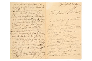 LISZT Franz (1811 - 1886)L.A.S., Budapest 22 février 1886, à un Président [Édouard COLONNE ?] ; 4 pages in-8 ; en français. Au sujet d'un concert de ses œuvres à Paris, et sa Messe de Gran. [Elle fut donnée deux fois à Saint-Eustache, sous...