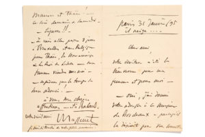 MASSENET Jules (1842 - 1912)L.A.S., Paris 31 janvier 1895 ; 4 pages in-8. Belle lettre à un jeune élève. Il a donné l'adresse de son ami à un Bordelais qui la désirait pour lui «soumettre un poème d'opéra, je crois. J'en reçois souvent de ces propositions - et vous en prendrez l'habitude ! Quelquefois cependant il peut se présenter une idée... Que faites-vous ? J'ai le désir de savoir quel sera votre premier envoi - je compte sur vous - et j'attends une belle chose. [...] Paris est dans la neige, la boue, le froid. Les théâtres sont assez pleins quand même. On s'entête à jouer Manon et Thaïs ! ce soir demain et samedi - bizarre !! Je vais aller passer 8 jours à Bruxelles et en Belgique pour Thaïs, la Navarraise et le Roi de Lahore»...