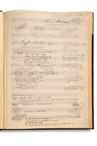 papier cristal et feuillets blancs intercalaires, le tout relié toile brune avec étiquette de titre. Très belle partition pour piano et orchestre, inspirée par le Japon. Composés en 1962 au retour d'un séjour au Japon, à l'occasion de l'exécution de la Turangalîla-Symphonie par Seiji Ozawa, les Sept Haïkaï veulent donner une forme musicale aux vives impressions ressenties par le compositeur lors de ses visites au parc de Nara, dans le parc naturel de Karuizawa, au mont Fuji, ou à l'île de Miyajima, et à la découverte de la musique japonaise (avec le gagaku) et des oiseaux japonais ; mais aussi prolonger les recherches rythmiques et chromatiques de Chronochromie. La composition de l'œuvre est très élaborée, en sept pièces courtes, comme les poèmes japonais du même nom ; elle dure 23 minutes. Créés à Paris, au théâtre de l'Odéon, par le Domaine musical sous la direction de Pierre Boulez, avec Yvonne Loriod au piano, le 30 octobre 1963, les Sept Haïkaï seront publiés aux éditions Alphonse Leduc en novembre 1966. L'œuvre sera dédiée : «à Yvonne Loriod, à Pierre Boulez, à Madame Fumi Yamaguchi, à Seiji Ozawa, à Yoritsuné Matsudaïra, à Sadao Bekku et Mitsuaki Hayama, à l'ornithologue Hoshino, aux paysages, aux musiques, et à tous les oiseaux du Japon». Le manuscrit est précédé de plusieurs pages de titre et de feuillets préliminaires. Une des pages de titre est couverte de notes pour la révision et la correction de la partition, une autre dresse la liste des sept mouvements (le sous-titre est alors rédigé ainsi : «esquisses japonaises, pour Piano solo, xylophone, marimba, et petit orchestre»). Suit la nomenclature des instruments, une analyse de chacune des pièces (que nous citerons dans le descriptif), et la «Liste des oiseaux japonais qui chantent dans cette œuvre : noms japonais, français et latins» (25 oiseaux). La Nomenclature des instruments comprend 11 Bois : 1 petite fl ûte, 1 fl ûte, 2 hautbois, 1 cor anglais, 1 petite clarinette mi bémol, 2 clarinettes si bémol, 1 clarinette basse si bémol, 2 bassons ; 2 Cuivres : 1 trompette, 1 trombone ténor ; 8 violons ; 2 claviers : 1 xylophone, 1 marimba (parties diffi ciles) ; 1 Piano solo (grand piano à queue de concert) (partie soliste) ; 4 percussions (4 exécutants) : I jeu chromatique de cencerros, II jeu chromatique de crotales (le 2e percussionniste joue aussi 1 triangle), III 18 cloches-tubes (jeu chromatique), IV 2 petites cymbales turques, 2 gongs, 1 cymbale chinoise, 2 tam-tams... Le manuscrit est très soigneusement noté au crayon noir sur du papier Durand à 26, 28, 30 ou 32 lignes ; chaque partie est précédée d'une page de titre. Il comporte sept mouvements ; nous citons l'analyse donnée par Messiaen dans les feuillets préliminaires. I. Introduction (12 p.). «Par les cencerros, cloches, trompette, trombone, et percussions métalliques : rythmes de l'Inde dédiés aux trois Shakti. Le piano et les bois font un canon rythmique rétrograde. Xylophone et marimba font une métabole, du tâla simhavikrama (force du lion) au tâla miçra-varna (mélange des couleurs). Aux violons : une phrase mélodique, dont on entend seulement la 1re strophe (la 2e strophe étant réservée pour la 7e pièce)». II. Le parc de Nara et les lanternes de pierre (14 p.). «Le Japon. Région de Nara. Quatre temples bouddhiques. Un parc. Des cerfs et des biches s'y promènent librement. Le soleil se joue entre les cryptomérias qui bordent l'allée principale. 3.000 lanternes de pierre se serrent à perte de vue». III. Yamanaka, cadenza (19 p.). «Les oiseaux qui chantent dans cette pièce ont été entendus en forêt, près du lac Yamanaka, au pied du mont Fuji. Ce sont à peu près les mêmes oiseaux que dans la 6e pièce. Il faut y ajouter : Misosozai (Midzodzotzaye) : Troglodyte japonais, confi é au xylophone - et Aka hara : Grive à fl ancs roux, confi ée au cor anglais. Aoji (Aôdji) : Bruant masqué du Japon - et Ôruri (Ô-louli) : Gobe-mouches bleu du Japon - ont été notés à Subashiri. Les trois “cadenza” du piano utilisent successivement : a) 1re cadenza : Kibitaki : Gobe-mouches Narcisse. b) 2e cadenza : Hôaka : Bruant à tête grise - et Hibari : Alouette des champs japonaise. c) 3e cadenza : Kuro tsugumi (Kouleu-tsougoumi) : Merle japonais». IV. Gagaku (12 p.). «Le Gagaku (Gagakou) est la musique noble du 7e siècle, au Japon. Elle se pratique encore à la cour impériale. Ne fi gurent ici que les deux timbres principaux de cette musique : le Shô (orgue à bouche), remplacé par un ensemble de 8 violons - le Hichiriki (hautbois primitif), remplacé par la trompette». V. Miyajima et le torii dans la mer (13 p.). «Peut-être le plus beau paysage du Japon. Une île, une montagne couverte de pins japonais vert foncé et d'érables (