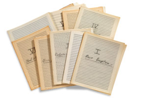 grand in-fol., plus des feuillets de titres et textes, et des feuillets blancs intercalaires, en 15 dossiers. Spectaculaire partition d'orchestre de cette œuvre monumentale pour chœur et très grand orchestre. Cette œuvre gigantesque est le fruit d'une longue élaboration, pour une commande de la Fondation Calouste Gulbenkian à Lisbonne, à la mémoire de son fondateur, pour le dixième anniversaire de la mort de ce grand mécène. De juin 1965 à février 1969, l'œuvre ne cessera d'évoluer et de se développer en 14 mouvements, pour atteindre une durée d'une centaine de minutes avec un eff ectif de plus de 200 interprètes. La première audition en fut donnée, lors du Festival Gulbenkian, au Coliseu de Lisbonne, le 7 juin 1969, devant 9.000 personnes, par l'Orchestre de Paris, le Chœur Gulbenkian et les sept solistes (Yvonne Loriod, Mstislav Rostropvitch, Michel Debost, Henry Druart, Alain Jacquet, Jacques Delécluse et François Dupin) sous la direction de Serge Baudo, puis par les mêmes interprètes avec les Chœurs de l'ORTF à Paris, au Palais de Chaillot le 20 octobre 1969. Elle fut publiée en 2 volumes aux éditions Alphonse Leduc en juillet et août 1972. La Transfi guration est composée pour un grand chœur mixte sur des textes latins, tirés de la Bible (Genèse, Psaumes, Livre de la Sagesse, Évangiles, épîtres de Saint Paul) et de la Somme théologique de Saint Thomas d'Aquin, avec sept solistes (piano, violoncelle, fl ûte, clarinette, xylorimba, vibraphone et marimba) et un très grand orchestre. D'une structure très complexe, elle forme un imposant retable en quatorze parties organisées en deux septénaires, présentant chacun deux récits évangéliques, chacun suivi de deux commentaires ou méditations, et un choral pour fi nir. «Cette violente masse orchestrale et vocale, rude et pleine d'écailles miroitantes, crée une émotion à sa mesure dans la terrible et splendide infi nité de l'Éternel tout-puissant» (Pierrette Mari). Le manuscrit est très soigneusement noté au crayon noir sur des papiers de formats diff érents, classés en chemises-dossiers : 9 chemises-dossiers sont sur papier à 28 lignes, et 6 autres sont en très grand format sur papier à 40 lignes ; chaque dossier comprend un feuillet de titre, et un feuillet avec le texte sacré en latin et en français. Le premier dossier contient le feuillet de titre et des feuillets préliminaires (7 p.) : table des pièces, nomenclature des instruments, note sur la prononciation du texte latin. La Nomenclature des instruments donne les eff ectifs (et l'étendue de certains instruments). «BOIS : 2 petites fl ûtes, 3 fl ûtes, 3 hautbois, 1 cor anglais, 1 petite clarinette en mi bémol, 3 clarinettes en si bémol, 1 clarinette basse en si bémol, 3 bassons, 1 contrebasson (18 bois en tout). CUIVRES : 1 petite trompette en ré, 3 trompettes en ut, 6 cors en fa, 3 trombones, 1 trombone basse, 1 tuba, 1 saxhorn basse en si bémol, 1 tuba-contrebasse en ut (17 cuivres en tout). SOLISTES : fl ûte solo, clarinette solo, xylorimba, vibraphone, grand marimba, violoncelle solo, piano solo (7 solistes en tout). CHŒUR : 10 1ers sopranos, 10 2es sopranos, 10 mezzos, 10 1ers contraltos, 10 2es contraltos, 10 1ers ténors, 10 2es ténors, 10 barytons, 10 1éres basses, 10 2es basses (100 chanteurs en tout). CORDES : 16 premiers violons, 16 seconds violons, 14 altos, 12 violoncelles, 10 contrebasses (en tout, 68 cordes). PERCUSSIONS : I triangle-grelot, réco-réco, 3 petites cymbales turques, cymbale suspendue, 1 paire de cymbales ; II jeu de crotales, 1 claves, wood-block, 6 temple-block, 1 paire de maracas, cymbales suspendues, 1 paire de cymbales ; III jeu de cloches-tubes ; IV 7 gongs (échelonnés de l'aigu au grave) ; V 3 tam-tams (1 grave, 1 plus grave, 1 très grave) ; VI cymbale suspendue, 3 toms, 1 grosse caisse (en tout, 6 percussionnistes - auxquels s'ajoutent 3 percussions-claviers fi gurant dans le groupe des solistes). Le 1er septénaire comprend : I. Récit Évangélique (4 p.) ; II. Confi guratum corpori claritatis suae (28 p.) ; III. Christus Jesus, splendor Patris (36 p.) ; IV. Récit Évangélique (4 p.) ; V. Quam dilecta tabernacula tua (27 p.) ; VI. Candor est lucis aeternae (20 p. grand format) ; VII. Choral de la Sainte Montagne (6 p. grand format). Le 2e septénaire comprend : VIII. Récit Évangélique (10 p.) ; IX. Perfecte conscius illius perfectae generationis (64 p. grand format) ; X. Adoptionem fi liorum perfectam (44 p.) ; XI. Récit Évangélique (7 p.) ; XII. Terribilis est locus iste (34 p. grand format) ; XIII. Tota Trinitas apparuit (74 p. grand format) ; XIV. Choral de la Lumière de Gloire (16 p. grand format). BIBLIOGRAPHIE Peter Hill et Nigel Simeone, Olivier Messiaen (