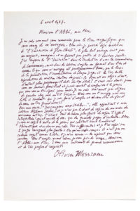 MESSIAEN Olivier (1908 - 1992)L.A.S. «Olivier Messiaen», 6 avril 1987, à un abbé ; 1 page in-4 Il remercie de l'envoi d'une rare et magnifi que édition de L'Imitation de Jésus Christ, qu'il considère comme «le plus bel ouvrage écrit croyant,...