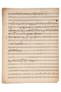 OFFENBACH Jacques (1819 - 1880)MANUSCRIT MUSICAL autographe ; 2 pages in-fol. Esquisses musicales sur les deux pages d'un feuillet à 20 lignes d'un fragment de partition d'orchestre (paginée 23-24) sur laquelle ne figure qu'une voix instrumentale (24 mesures) ; sur le feuillet retourné, Offenbach a noté plusieurs thèmes et esquisses, notamment pour une «Ouverture» et un «air Rococo». La page est certifiée en haut au crayon par Pierre Cornuau