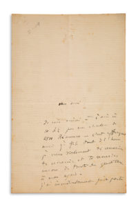 OFFENBACH Jacques (1819 - 1880)L.A.S. «J. Offenbach», 15 juillet 1865, à un ami ; 3 pages in-8 à son chiffre. Il est arrivé à Paris «par une chaleur de 2500 Réaumur - c'est effrayant. Aussi je file tout à l'heure, je veux seulement te remercier, te remercier et te remercier de toute ta gentillesse à mon égard. J'ai immédiatement fait partir tes deux mille francs à la personne de la Rue de la Michodière»... Il donne son adresse : «Villa Orphée à Étretat», pour faire suivre son courrier...