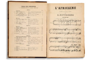OPÉRA Collection de premières éditions et éditions anciennes de partitions piano-chant d'opéras français ; 11 volumes reliés, petit in-fol. MEYERBEER Giacomo. - Robert le Diable (Paris, Schlesinger, [1831], 1re édition, 407 p., titre avec vignette lithographiée, musique et table gravées, rel. de l'époque demi-chagrin rouge. - Die Hugenotten (Les Huguenots) (Leipzig, Breitkopf & Härtel, [1836]), 1re édition allemande, 2 volumes, 466 p., musique gravée, cotage n° 5720, paroles en allemand et français, riche reliure de l'époque demi-veau brun orné, aux plats brodés avec les titres en perles dorées. - L'Africaine (Paris, Benoit ainé, [vers 1860]), demi-maroquin (qqs ff. déreliés). BERLIOZ Hector. La Damnation de Faust (Paris, Richault, [1854]), 1re édition [Hopkinson 54 D(a)], 390 p., portrait par Charpentier d'après Prinzhofer, musique gravée, rel. moderne demi-maroquin vert à coins ; plus une autre édition (Richault, [c.1882]). LECOCQ Charles, La Fille de Madame Angot (Paris, Brandus, [1873]), titre illustré par Barbizet, exemplaire de l'auteur avec envoi de l'éditeur Brandus offrant à Lecocq ce 10.000e exemplaire ; ex-libris de Lecocq (puis de Georges Van Parys), reliure maroquin olive aux plats ornés d'une riche décoration dorée et mosaïquée avec médaillon portant l'inscription «10.000e exemplaire de la partition de La Fille de Madame Angot de Ch. Lecocq», doublures de veau aubergine avec décoration dorée, tranches dorées et ciselées (chemise et étui). BIZET Georges, Carmen (Paris, Choudens, nouvelle édition). REYER Ernest, Sigurd (sans p. de titre). SAINT-SAËNS Camille, Samson et Dalila (Paris, Durand). VERDI Giuseppe, Aïda (Paris, Alphonse Leduc).