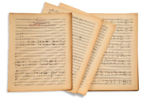 Pierné. Cydalise et le Chèvre-pied, ballet en deux actes et trois tableaux, a été composé en 1913-1914, et terminé le 14 février 1915. Gabriel Pierné a travaillé sur un très joli livret de Gaston de Caillavet et Robert de Flers, qui ont imaginé le retour des vieilles divinités sylvestres à Versailles, au temps de Louis XIV: «Comment le petit chèvre-pied Styrax, surpris au détour d'un chemin dans les bois de Ville-d'Avray, parvient à la cour de Versailles dans un panier de costumes de théâtre, comment il assiste au ballet oriental que l'on répète pour une fête royale, comment il trouble la belle Cydalise et la rejoint après les danses dans son appartement, c'est ce que nous montrent les librettistes ; mais c'est la musique de Pierné qui enveloppe ce conte galant d'une atmosphère tour à tour ironique et tendre, c'est elle qui donne aux faunes, aux nymphes cette grâce d'un modernisme troublant sur des modes antiques - l'hypolydien de la leçon de danse des Nymphes (gamme de fa, avec le si dièze) - et c'est elle qui évoque le souvenir de Lully et de Marc-Antoine Charpentier dans le divertissement indien du second acte» (René Dumesnil). Il faudra attendre le 15 janvier 1923 pour que ce ballet, achevé en 1915, voie le jour à l'Opéra de Paris, sous la direction de Jacques Rouché, merveilleusement monté dans une chorégraphie de Léo Staats, des décors et costumes de Maxime Dethomas, avec Carlotta Zambelli dans le rôle de Cydalise et Albert Aveline dans celui de Styrax, sous la direction musicale de Camille Chevillard. Pierné en tirera deux suites pour orchestre, créées en 1926 avec un grand succès. Bien avant, en avril-mai 1915, Pierné a réalisé cette transcription pour deux pianos des danses de Cydalise. Le manuscrit est à l'encre noire (et rouge pour les titres) sur papier à 24 lignes, de l'écriture très nette, précise et élégante de Pierné, à l'image de sa musique, en deux cahiers. La leçon de danse (Thème varié dans le mode hypolydien), marquée Modéré, signée et datée en fin «Avril 1915. Paris» (22 pages). Citons le livret : «Et c'est maintenant l'école des Nymphes qui arrive [...] Leur gouvernante et le vieux faune réunissent leurs élèves et leur donnent une leçon de danse sur le mode hypolydien. Styrax s'empare de la gourde du vieux faune et la vide, si bien qu'il s'enivre. Styrax a pour danseuse la petite nymphe Mnésilla. Par ses gambades et ses folies, il jette le désarroi dans les rondes». Deux Danses. - Danse de Styrax (2e tableau), marquée Allegro non troppo, datée en fin «Mai 1915» (8 pages). C'est le final du 2e tableau : «le Capitaine et le Fermier Général félicitent le Maître de Ballet. Cydalise fait signe qu'elle a froid. Le Fermier Général, pour lui chercher une mante, se précipite vers le panier, l'ouvre... Styrax en jaillit, bondit vers Cydalise et l'embrasse. Stupeur de tout le monde. Le Maître de Ballet lui demande qui il est, et Styrax, au grand émerveillement général, se met à danser une danse effrénée, à laquelle Cydalise finit par se mêler. Tout le monde est gagné par ce mouvement frénétique, danse générale au cours de laquelle Cydalise et Styrax s'enlacent - s'enlacent si étroitement que le Fermier Général et le Capitaine interviennent et entraînent Cydalise. Avant de sortir, elle jette à Styrax la rose de sa ceinture, et Styrax lui donne la flèche de l'Amour qu'il a gardée. Styrax brandit la rose comme un trophée et danse sa victoire et sa joie. Tous l'imitent». - Final du 3e tableau, marqué Allegretto, Bien mesuré et rythmé, daté en fin «Avril-Mai 1915» (8 pages). Le livret indique que Styrax, dans la chambre de Cydalise, a découvert «la corbeille à billets doux. Cydalise l'invite à lui en écrire un, en lui tendant une plume. Mais Styrax ne sait pas écrire. Elle veut lui faire lire ceux qui restent dans la corbeille. Il ne sait pas lire. Que sait-il donc faire ? Jouer de la flûte ! Il joue de la flûte de Pan, elle danse. Peu à peu il se mêle à cette danse, qui devient amoureuse, puis passionnée. Elle lui fait jurer de l'aimer toujours. Il jure, sur la rose qu'elle lui a donnée, de ne jamais la quitter. Ils vont, enlacés, vers le fond. Elle ouvre la fenêtre pour respirer l'air du matin : du fond du jardin montent les voix de la forêt qui s'éveille, Styrax s'arrête, très ému. Cydalise s'efforce de reprendre Styrax, de l'écarter de la fenêtre. Il résiste, elle insiste, elle lui bouche les yeux de ses mains. Styrax se sent repris par les voix de la nature. Et voici qu'au bord des fenêtres, dans le jour qui monte sur le ciel rose. apparaissent les visages des chèvre-pieds et des nymphes. Quelques-uns sautent dans la chambre, les petits faunes et dryades tombent des lucarnes ou dégringolent des œils-de-bœuf. Ils portent des branches de roses, des fleurs rus