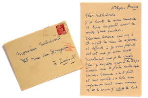 POULENC Francis (1899 - 1963)L.A.S., Noizay Dimanche [12 mai 1949], à Marcel MIHALOVICI ; 2 pages in-8, enveloppe. Il remercie Mihalovici de l'envoi de son 3e Quatuor : «Plus je vais plus j'aime la musique (réussie bien sûr) que je ne saurais pas faire. Et Dieu sait s'il y en a hélas !» Il a entendu avec plaisir les Variations de Mihalovici. «Je termine un séjour tourangeau où j'ai amorcé mon nouveau Concerto de piano et préparé mon récital du 18 avec Fournier»...