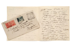 maroquin vert ; en italien. Très intéressante correspondance amicale, principalement relative à ses opéras. [Carlo CLAUSETTI (1869-1943), compositeur napolitain, librettiste, poète et traducteur, directeur de la filiale de l'éditeur musical Ricordi à Naples, se lia avec Puccini à l'occasion de la création à Naples de Manon Lescaut (21 janvier 1894) ; une amitié fraternelle unit les deux hommes, et se développa dans une collaboration artistique confiante, Puccini considérant Clausetti comme un autre lui-même.] 28 mars 1894, chaleureuse protestation d'amitié au poète aimable, au musicien inspiré, à l'artiste polychrome («amabile poeto musico inspirato artista policolore - T'adoro»... Il rappelle le baiser qui a scellé leur amitié... Pise 27 octobre : il sera à Torre del Lago jusqu'au 15 novembre. Milan 10 janvier 1895. Il est peu enthousiaste pour Le Villi à Molfetta, et veut savoir si l'orchestre et le chef valent quelque chose, et si on soignera la mise en scène, car il est inutile de monter Le Villi sans garantie de succès. Et pour le San Carlo, c'est NON, opinion partagée par Giulio Ricordi : on ne peut forcer l'opinion ; l'opéra est tombé à Naples, et on croirait qu'on veut profiter du succès de Manon pour réhabiliter Le Villi : «Non conviene sforzare l'opinione publica. A Napoli cadde l'opera et parrebbe che si volesse approfittare del successo di Manon per far riabilitare le Villi»... Milan 11 février. Il salue l'organisateur théâtral, auteur de Manon Lescaut dans l'Italie du Sud («celebre organisatore teatrale immenso animatore di publici, autore dell'opera Manon Lescaut nel meridionale d'Italia !»). Il ne peut dire combien il lui doit. Il est frappé par l'idée de la nouvelle mise en scène du 3e acte de La Bohème, mais demande des détails pour mieux comprendre comment disposer le chœur («il coro a semicerchio o su due ale ? e i soldati come ? e dove ?»)... Milan 18 février, longue lettre sur l'opéra Guglielmo Ratcliff de MASCAGNI, qui a été un succès ; Mascagni a fait de grands progrès dans la technique et l'instrumentation, et dans l'enchaînement des morceaux ; mais Puccini critique le livret, et ne croit pas que l'opéra intéressera beaucoup ; de plus il faut un ténor avec des poumons d'acier («ci bisogno un Tenore con pumoni di ghisa») ; et Mascagni a tout pris dans Le Villi («Le Villi ci sono a piene mani»)... Il avance bien dans La Bohème, mais il devra travailler comme un chien pour la terminer l'année prochaine («Bohème proceda bene ma sono molto indiétro e devo lavorare come un cane se voglio finirla per l'anno venturo»). Mascagni va diriger Manon à Livorno... Pescia 7 juin. Il est à la campagne, Villa Castellaccio à Pescia, et il travaille. Pescia 29 septembre. Il a beaucoup vanté l'Hymne de Clausetti à Ricordi, qui en fera toutes les éditions possibles, même turques (ottomanes), mais il a trop de travail pour en faire l'orchestration («Ho tanto da fare che non posso proporre strumentari, come vorrei, l'inno»)... Palerme 9 avril 1896. Il explique son départ précipité pour Palerme afin de préparer la création sicilienne de La Bohème (dont il a remanié le 2e acte après les représentations de Rome et Naples) [9 mai]. Ils sont en pleines répétitions, et il en attend une excellente exécution («deduco, predico, confido, spero un'ottima, intonata esecuzione»), avec de très bons chanteurs, dont la Stehle et la Giacchetti pour Musette, et le Schaunard qu'il désirait. Samedi on reprend Manon avec Mugnone. La Bohème viendra probablement le samedi suivant. Puccini demande des détails sur les représentations au San Carlo... 26 mai 1897. Il regrette de quitter son ami, mais la soif de verdure («la sete di verde») est trop forte... Levico 2 juillet. Il revient de sa conquête de Berlin ; il sera le 15 à Torre del Lago, et se remettra à Tosca trop longtemps abandonnée («riprendero Tosca de tanto tempo abbandonata»)... Naples 12 octobre 1898. Il reproche plaisamment à son lascif ami de ne pas lui écrire... Il travaille lentement à Tosca, comme un castor à sa maison («Io lavoro a Tosca lentamente come il castoro alla sua casa»). Il a acheté une propriété [à Chiatri] et construit une villa ; il a des cheveux blancs et s'approche du repos éternel calmement, en espérant que la fin viendra le plus tard possible («Ho comprato un podere e fabbrico una villa. Ho dei capelli bianchi e m'avvicino al riposo eterno con calma e sperando che la fine sia distanto più possibile»... Torre del Lago 5 novembre 1899. Il attend des projets. Pour sa maison, il demande à Clausetti de lui trouver une devise qu'il aimerait faire peindre pour éloigner les casse-pieds («indicante : lasciatemi tranquillo - non voglio importuni seccatori»)... Torre del Lago 10 novembre. Longue lettre réagissant