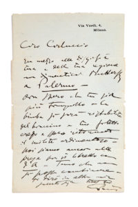 PUCCINI Giacomo (1858 - 1924)L.A.S. «G. Puccini», Milano [1906], à Carlo CLAUSETTI à Naples ; 1 page petit in-4, adresse au verso ; en italien. Il est désolé des malheurs de son cher «Carluccio». On va donner Butterfl y à Palerme.Il est toujours aux prises avec d'A[nnunzio] pour le livret de son prochain opéra («alle prese per il libretto con d'A»)...