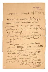 PUCCINI Giacomo (1858 - 1924)L.A.S. «G. Puccini», Milano 14 décembre 1909, à Zorah DORLAC, au Théâtre de la Monnaie à Bruxelles ; 1 page petit in-4, adresse au verso (papier lég. bruni, marque de pli) ; en italien. Il a toutes ses...