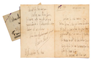 RAVEL Maurice (1875 - 1937)L.A.S. «Maurice Ravel», 2 août 1901, à Jane GAUDIN, à Saint-Jean-de-Luz ; 4 pages in-8 à l'adresse 40 bis, rue de Douai, enveloppe déchirée. Après son succès au concours du Prix de Rome (2e second grand prix). «Combien je vous remercie, ma chère Jane, de vos bonnes félicitations, et que je suis confus du peu d'empressement que j'ai mis à y répondre ! La cause en est la lassitude que laisse après soi un surmenage de près de deux mois. Le concours est bien dur, les fatigues en sont considérablement adoucies lorsque l'on en obtient un résultat. Et c'en est un fort satisfaisant qu'un 2me prix pour un premier concours. Nous aurons peut-être bientôt l'occasion de parler directement de tout cela. Nous espérons pouvoir aller à Luz vers la fi n d'août ; mais cela n'est encore qu'à l'état de projet, et je n'ose trop y compter. Ce serait si charmant de se retrouver tous ! Quelles belles balades à bécane, et en auto ! Car c'est en cet équipage que nous pensons aller vous voir. La voiture de mon père, sur laquelle nous avons déjà fait quelques promenades, nous a donné pleine satisfaction. Cela est de bon augure !»... L'intégrale, n° 25.