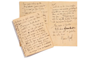 RAVEL Maurice (1875 - 1937)2 L.A.S. «Maurice Ravel», juin-novembre 1911, à Marie GAUDIN ; 4 pages in-12 et 4 pages in-8. Projet de séjour avec sa mère à Ciboure, et retour à Paris. La Grangette à Vulaines s/Seine 22 juin. Il prie Marie de trouver un logement à Ciboure, pour lui et sa mère. «Nous rentrons à Paris à la fi n de ce mois. Et j'estime, ma foi, que pour tant faire que de griller, il vaut mieux griller au bord de la mer. Donc, si c'était possible, nous irions là-bas à partir du 15 juillet, et resterions 3 mois. Édouard ne pourrait sans doute s'absenter qu'un mois environ ; mais on tâcherait de le faire rester davantage. Il faut 2 chambres, dont l'une puisse contenir 2 lits. Bien entendu, pension comprise je ne veux pas que maman fasse autre chose que se reposer. Nous préférerions que ce soit chez des parents. Les repas pris en commun seraient moins embêtants que chez des étrangers». Il donne quelques noms... «Inutile de vous dire qu'une simplicité économique nous conviendra particulièrement»... 13 novembre. «Vous ne pouvez imaginer ce que j'ai eu de travail depuis mon retour. Je ne suis presque pas sorti ; mon éditeur envoyait chercher au fur et à mesure ce qu'il y avait de fait. Maintenant qu'une grande partie est à la gravure, je veux me dépêcher de vous donner de nos nouvelles, avant de me remettre à l'ouvrage. [...] il est temps enfi n que nous vous remercions tous de tout ce que vous [avez] fait pour nous rendre notre beau pays encore plus sympathique. Je veux aussi vous remercier du beau coussin. Il faut que vous veniez voir l'eff et qu'il fait sur une bergère rose où sa place semblait marquée. Le soleil le rend encore plus éclatant. C'est que nous avons du soleil, à Paris, encore plus que vous, peut-être. Pas tous les jours, c'est vrai. [...] Édouard, qui était parti épuisé de Ciboure, a constaté, en rentrant, qu'il avait engraissé de 4 kilogs. Voilà ce que c'est d'avoir suivi les conseils du médecin, et de n'avoir pas prolongé mes bains au-delà de 5 minutes !»... L'intégrale, nos 401 et 419.