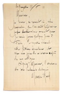 RAVEL Maurice (1875 - 1937)L.A.S. «MR», La Grangette 26 juin 1912, à G. JEAN-AUBRY au Havre ; 1 page in-12, adresse au verso. Amusante lettre après un «terrible article» de Camille MAUCLAIR dans Le Courrier musical... «Camille demande-t-il mon internement ? ou une condamnation pour outrages publics à la pudeur auditive ? Je pense que ni Daphnis et Chloé, ni leur papa ne s'en porteront mieux, ni plus mal. En tout cas, je ne vois personnellement aucun inconvénient à ce que vous exprimiez votre opinion, et vous remercie vivement de votre sympathie artistique».... On joint une L.A.S., La Grangette 10 juin 1911, [à Édouard Ganche ?] (1 page in-8), regrettant de ne pouvoir ses rendre à une réunion. L'intégrale, nos 471 et 399.