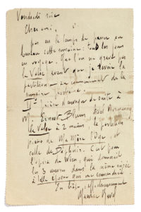 RAVEL Maurice (1875 - 1937)L.A.S. «Maurice Ravel», Vendredi soir [17.XII.1920], à Lucien GARBAN ; 1 page in-12, adresse au verso. Il est «tous les jours en voyage. Que l'on ne grave pas La Valse avant que je revoie la partition - au commencement de la semaine prochaine». Il demande d'envoyer à Ernest Blum : «La Valse à 2 mains, la partition piano de Ma Mère l'Oye, et celle de Daphnis. C'est pour l'opéra de Wien, qui donnerait les 3 oeuvres dans la même soirée»... L'intégrale, n° 1265.
