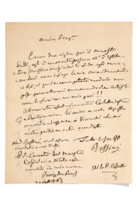 ROSSINI Gioacchino (1792 - 1868)L.A.S. «Rossini», Passy de Paris 30 septembre 1867, à Eugenio COSSELLI, «Cantore e Pittore» à Lisbonne ; 1 page in-4, adresse au verso ; en italien. Lettre de présentation du maestro DADDI [João Guilherme Bell DADDI (1813-1887)], professeur de musique et de piano, qu'il a prié de recommander ses chers Marchisio au Roi («egli è enchente persona ed' è Istitutore pianistico musicale di S.M. egli raccomanderà mene lusingo le mie care Marchisio al Rè»). Il convient de le présenter aux artistes comme un de leurs pairs. Rossini salue aff ectueusement ses chères Carlotta et Barbara... [Eugen Kuhn chanta sous le pseudonyme d'Eugenio Cosselli (1834-1875) ; il avait épousé la cantatrice Carlotta MARCHISIO.]