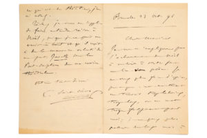 SAINT-SAËNS Camille (1835 - 1921)L.A.S. «C. Saint-Saëns», Bruxelles 23 octobre 1896 ; 4 pages in-8. Sur sa décision de ne plus écrire d'opéra. Il ne comprend pas l'acharnement d'Édouard Noël «à vouloir à toute force me lire son poème. Je...
