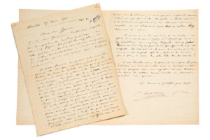 SAINT-SAËNS Camille (1835 - 1921)L.A.S. «C. Saint-Saëns», Menton 25 mars 1911, à Xavier LEROUX ; 4 pages in-4. Longue et intéressante lettre sur la question de la prose en musique, à la suite d'une enquête de Musica. Il regrette de n'avoir pas été sollicité, «car cette question me tient à cœur et vous auriez pu me mettre à contribution en citant une partie du chapitre qui lui est consacré dans Portraits et Souvenirs. La prose française me paraît anti-musicale, parce qu'elle est peu accentuée, les hiatus, les séries de syllabes lourdes qu'on y rencontre souvent, lui ôtent le rythme et la sonorité nécessaires à la musique. Une prose spéciale, rythmée, sonore, ayant enfin, sauf la mesure, toutes les qualités du vers et même le lyrisme, peut lui convenir et même lui être très utile [...] quand le Verbe est dans la musique». Il cite en exemple deux airs de Faust et de Samson, «passages purement mélodiques ; [...] la phrase musicale importe seule et la parole doit être son esclave» ; de même au paroxysme du drame à la fin du grand duo des Huguenots, «mais ce sont là des cas exceptionnels et très rares. D'ordinaire, c'est à la musique de se mouler sur le vers», et dans ce cas les beaux vers lui apportent rythme et sonorité, «qu'elle n'a plus qu'à mettre en lumière». L'étude de Musica oppose le rythme des phrases, et celui de la musique qui, dit-elle, «procède par mesures égales. Ici, je cesse de comprendre. La musique procède comme elle veut ; elle possède une souplesse dans l'unité, et un musicien maître de son art ne sera nullement gêné par “le rythme propre” [...] que le vers lui impose ; il y trouvera plutôt une aide et un soutien». Il cite en exemple le «délicieux air de Chérubin», Non so più cosa son... : «comment de ce rythme obstiné et rigoureux MOZART a su tirer une des perles les plus pures de sa partition ! La mélodie sort naturellement du vers comme la fleur du bouton»... On accuse aussi GOUNOD d'avoir martyrisé les vers : «Ah ! je ris de me voir / Si belle en ce miroir», en coupant : «“Ah ! je ris / de me voir si belle / en ce miroir” Alors que si quelqu'un disait ces vers, sans les chanter, il les accentuerait de la même façon»... Il rappelle comment Victor HUGO ne «sacrifie jamais la césure» de son alexandrin, afin d'en conserver le rythme primitif; et il parle du cas de SCHUMANN et son «abus des porte-à-faux» qui est une exception... Si quelqu'un a été respectueux de son texte, c'est GLUCK, dans Armide, où sans égaler Racine et Corneille, Quinault s'est surpassé : «Les vers ont-ils le moins du monde gêné la musique et empêché Gluck, tout en les suivant pas à pas, d'écrire la plus belle des œuvres»... Il conclut que «la vraie prose française substituée au vers pour être mis en musique n'est pas un progrès, mais une régression et une hérésie. Le succès de certaines œuvres récentes ne saurait modifier mon opinion ; Le succès ne justifie pas tout».