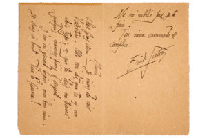 SATIE Erik (1866 - 1925)L.A.S. «Erik Satie», Mardi [3 septembre 1918], à Léon-Paul FARGUE ; 1 page in-12, adresse au verso (cartelettre). «Cher Gros Ami - Je viens de voir Valentine [Hugo]. Elle me dit que tu es un chic type ; & que tu dois me...