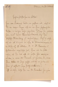 STRAUSS Richard (1864 - 1949)L.A.S. «Richard Strauss», Weimar 25 octobre 1889, à Hans von BÜLOW ; 2 pages et demie in-8 (quelques légères rousseurs) ; en allemand. Belle lettre du début de sa carrière à Weimar adressée à Hans von Bülow. Cette année-là, Strauss était arrivé à Weimar en tant que second maître de chapelle. Hans von BRONSART lui a fait savoir qu'il avait prié Bülow d'honorer de sa participation comme soliste un des concerts d'abonnement. En tant que chef d'orchestre des quatre premiers concerts d'abonnement, Strauss demande à Bülow de lui faire le grand honneur de jouer dans l'un d'eux, à la date qui lui conviendrait. Sachant que Bülow doit jouer le 13 novembre au bénéfi ce de la Musikschüle, Strauss lui propose, s'il accepte vraiment de lui donner le grand plaisir de jouer dans un de ses concerts, la date du 11 novembre... Il remercie Bülow de l'aimable accueil qu'il a réservé à son ami Friedrich Rösch, en lui permettant d'assister à une de ses répétitions. Il se réjouit du bon rétablissement de leur ami Eugen SPITZWEG [premier éditeur de Strauss, aux éditions Joseph Aibl ; c'est par son intermédiaire que Strauss entra en relation avec Bülow.] «Herr von Bronsart teilte mir gestern mit, daft er Sie vor einigen Tagen gebetenhabe, eines unsrer Abonnementconcerte durch Ihre solistische Mitwirkung zu verherrlichen. Auch ich mochte mich nun als Dirigent der ersten 4 Abonnentconcerte, [...] Ihnen mit der Bitte nahen, ob Sie uns nicht die große Ehre erweisen würden, in einem der Concerte zu spielen, die [...] natürlich an jedem von Ihnen zu wühlenden Tage stattfi nden lainnten ! Ist es wahr, daß Sie am 13. November hier zum Besten der Musikschule spielen ? Wenn Sie nun überhaupt mir die große Freude bereiten wollen, in einem meiner Concerte zu spielen, ware es Ihnen nicht am 11. November [...] P.s. Herzlichsten Dank auch meinerseits für die freundliche, liebenswürdige Aufnahme meines Freundes Rösch u. die Gewährung von dessen Bitte, Ihre Proben besuchen zu dürfen. - Die Nachricht von der Wiederherstellung unsres Freundes, Eugen Spitzweg, wird Sie wohl auch hocherfreut haben !»