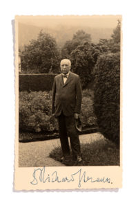 au dos à un de ses interprètes de Salomé. La photographie représente Strauss debout, dans un parc. Au dos, il envoie ses vœux pour le 75e anniversaire du chanteur, en souvenir de nombreuses belles heures de travail artistique commun (avec des remerciements particuliers pour Hérode !) et de conversation des plus agréables, quoique parfois orageuses : «In Erinnerung an viele schöne Stunden gemeinsamen künstlerischen Wirkens (mit besonderem Dank für den Herodes !) u. angenehmster wenn auch manchmal stürmischer Mitunterhaltung»...
