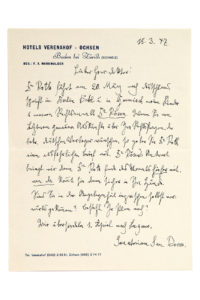 STRAUSS Richard (1864 - 1949)L.A.S. «Richard Strauss», Baden bei Zürich 15 mars 1947, à «Herr Doktor» ; 1 page et demie in-8 ; en allemand. Le Dr. Roth se rendra le 20 mars en Allemagne ; il parlera à Berlin avec Örtel, et à Garmisch avec les enfants de Strauss et son avocat le Dr Rösen. Il demande où en est leur aff aire. Il déménagera le 1er avril à Lugano, au Sanatorium San Rocco. Le 1er juillet, Volkmar Andreae dirigera à Zurich la Domestica. Auparavant, au Stadttheater, auront lieu deux représentations d'Ariadne auf Naxos avec l'ensemble et l'orchestre du Wiener Staatsoper