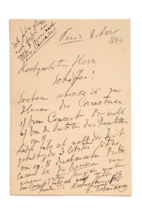 TCHAIKOVSKY PIOTR ILITCH (1840-1893)L.A.S., Paris 8 avril 1889, à Franz SCHÄFFER ; 1 page in-8, en allemand. Au sujet de son fameux premier Concerto pour piano. [Schäff er était correcteur chez l'éditeur musical allemand Daniel Rather, qui publia le Concerto.] Il lui envoie les corrections 1) du Concerto en si bémol mineur 2) de la partition du Quatuor op. 11 Malheureusement, il n'a pas eu le temps de parcourir les trois derniers mouvements de l'op. 11. Il faut en faire faire la révision par un bon musicien. Dans le Concerto, il a trouvé beaucoup de fautes. Il part pour Londres, puis Tifl is dans le Caucase. «Soeben schicke ich zu Ihnen die Correcturen 1) vom Concert B-moll 2) von der Partitur des Quartetts op. 11 Leider habe ich nicht die Zeit gehabt die letzten Sätze von op. 11 durchzusehen. Bitte lassen Sie die Revision von einem guten Musiker machen. Im Concert habe ich viel Fehler gefunden»... [Rather ne publia pas le 1er Quatuor op. 11.] Texte original russe (et traduction anglaise) : www.en.tchaikovsky-research. net/pages/Letter_3829a