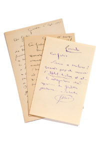 VERDI Giuseppe (1813 - 1901)3 L.A.S. «G. Verdi», 1891, à Giulio RICORDI ; 1 page in-8 chaque, enveloppes. Genova (Gênes) 6 février. Il viendra à Milan, avec Peppina, vers le 10 au soir ; il partira le matin suivant pour passer 3 ou 4 jours à Sant' Agata, et reviendra à Milan pour parler de leurs aff aires... Genova 18 mars. Dumolard a envoyé à Peppina les deux volumes de Casati, que Verdi prie Ricordi de le payer. Lundi. Il annonce son arrivée à Milan, à l'Hôtel Milan.