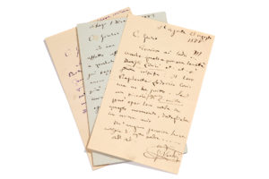 VERDI Giuseppe (1813 - 1901)L.A.S. «G. Verdi», à Giulio RICORDI ; 1 page in-8, enveloppe ; en italien. 1er décembre 1883, au sujet de Don Carlo (dont la nouvelle version sera donnée à Milan le 10 juin 1884). Il n'a pas d'ordres à donner. Il assistera à quelques répétitions pour expliquer les nouveaux arrangements et coupures au Don Carlos, rien de plus. Il ne peut se charger de l'exécution musicale et scénique : «Ion non ho ordini a dare. Aff atto aff atto. Assisterò a qualche prova per spiegare qui pezzi e squarci fatti di nuovo al D. Carlos : nulla di più. Io non posso incaricarmi del complesso dell' esecuzione musicale e scenica»... On joint 2 L.A.S. au même (1 p. in-8 chaque) : - S. Agata 23 août 1888, au sujet d'une société lyrique, à laquelle il donne mille lires ; - Milan vendredi, il est arrivé la veille et part pour Gênes ; il sera de retour dimanche, et viendra saluer Giulio lundi matin, s'il ne part pas à la campagne.