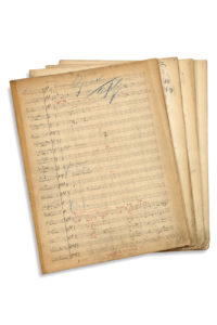 WALDTEUFEL Émile (1837 - 1915)MANUSCRIT MUSICAL autographe signé «Émile Waldteufel», Bouff ées printanières (1897) ; 24 pages in-fol. Très rare manuscrit du roi français de la valse. Cette partition d'orchestre d'une suite de valses est écrite à l'encre noire sur papier à 20 lignes, avec des variantes d'instrumentation à l'encre rouge ; ce manuscrit a servi de conducteur, et a été utilisé pour la gravure. L'orchestre comprend : piccolo, grande fl ûte, hautbois, 2 clarinettes, bassons, 4 cors à pistons, 2 pistons, 3 trombones, ophicléide, timbales (et triangle), batterie, et le quintette à cordes. La partition est ainsi divisée : Andantino (p. 1-2) ; Valse N° 1, Grazioso (p. 3-7) ; N° 2 (p. 8-10) ; N° 3 (p. 11-13) ; N° 4 (p. 14-17) ; Coda (p. 18-24)