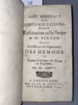 [BINET Benjamin]. Idée générale de la théologie payenne, servant de Réfutation au Système de M. Bekker. Touchant l'existence & l'opération des démons. Ou Traité historique des dieux du paganisme. Par M. B.***. Amsterdam, Jean du Fresne, 1699 ; in-12 de [6] feuillets, 227 pages, veau marbré de l'époque, dos à nerfs orné de motifs dorés, pièce rouge.